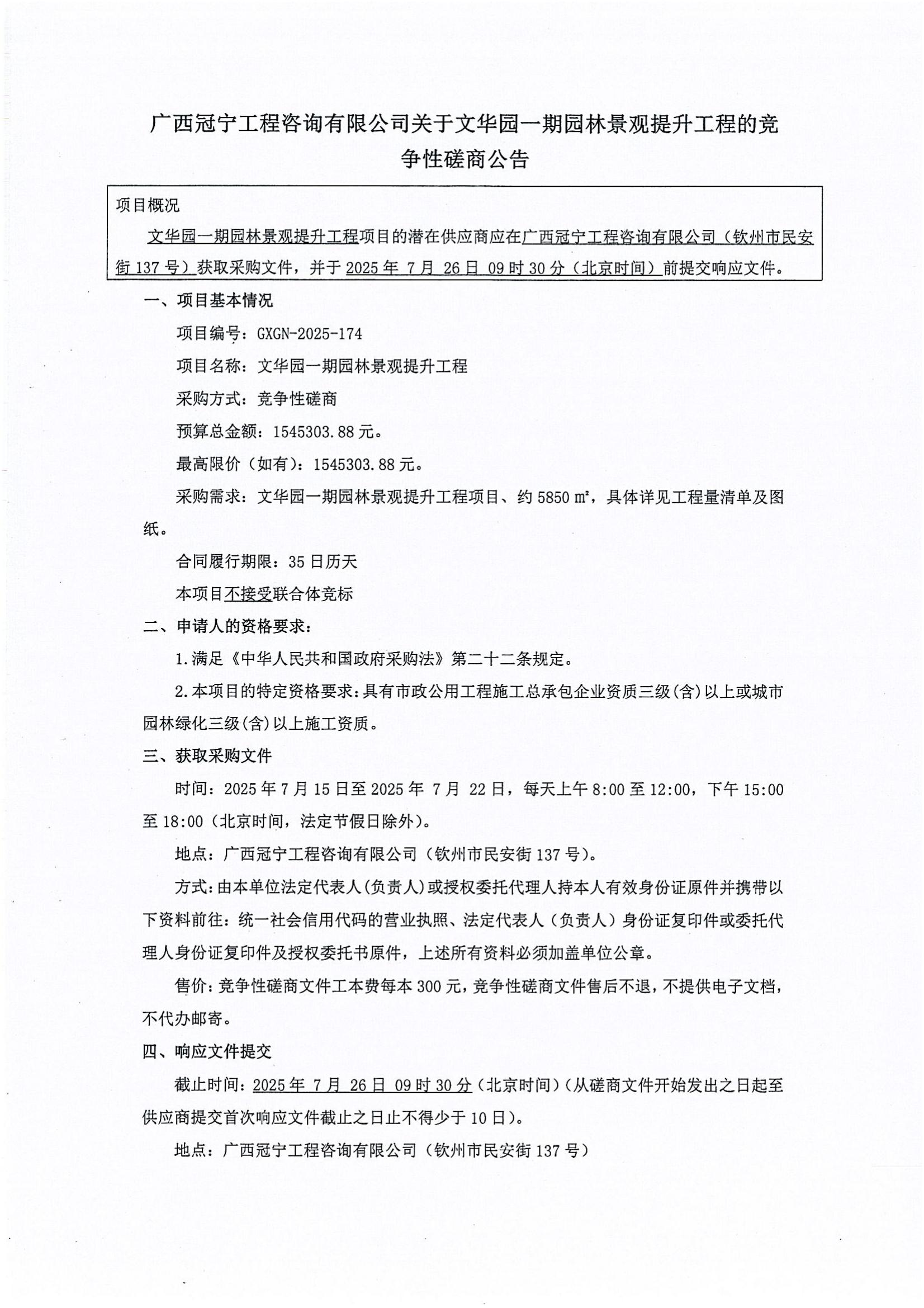 廣西冠寧工程咨詢有限公司關(guān)于文華園一期園林景觀提升工程(項(xiàng)目編號(hào):GXGN-2025-174)成交公告