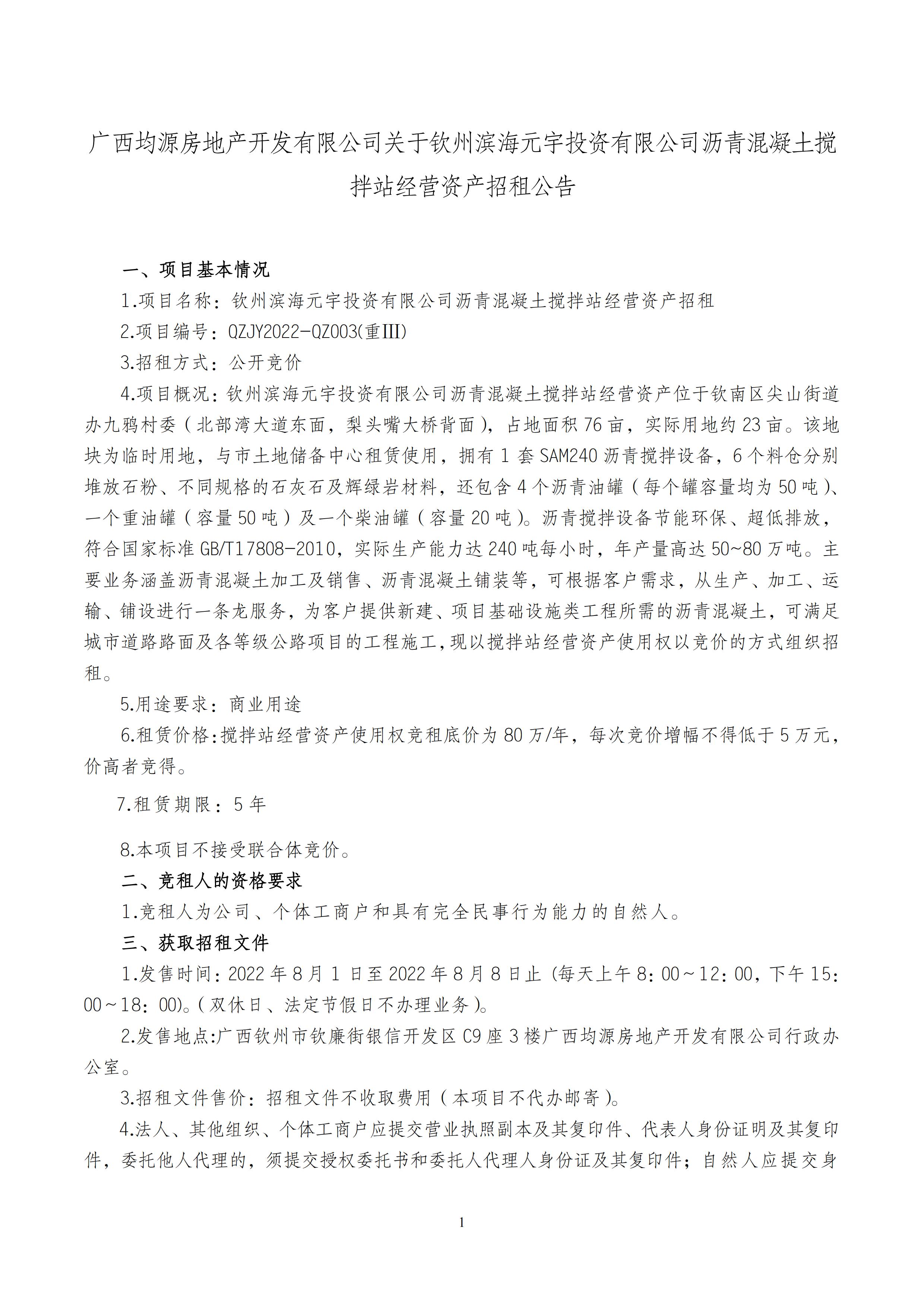廣西均源房地產(chǎn)開發(fā)有限公司關(guān)于欽州濱海元宇投資有限公司瀝青混凝土攪拌站經(jīng)營資產(chǎn)招租公告