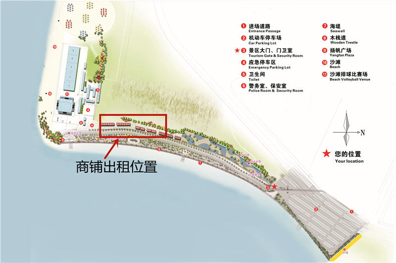 商鋪總面積為776㎡,共22間商鋪,其中18㎡商鋪20間,208㎡商鋪2間,經(jīng)營(yíng)范圍:海鮮大排檔、特色小吃、燒烤、糖水、飲料、沙灘玩具等。