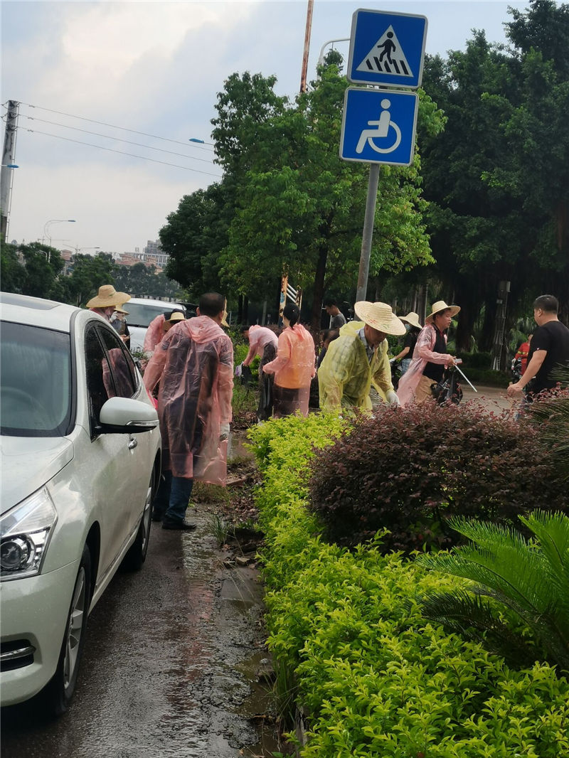 活動(dòng)當(dāng)天,煙雨朦朧。志愿者們有的拿著鏟子,有的拿著掃把,有的拿著垃圾簍,冒雨干起活來。