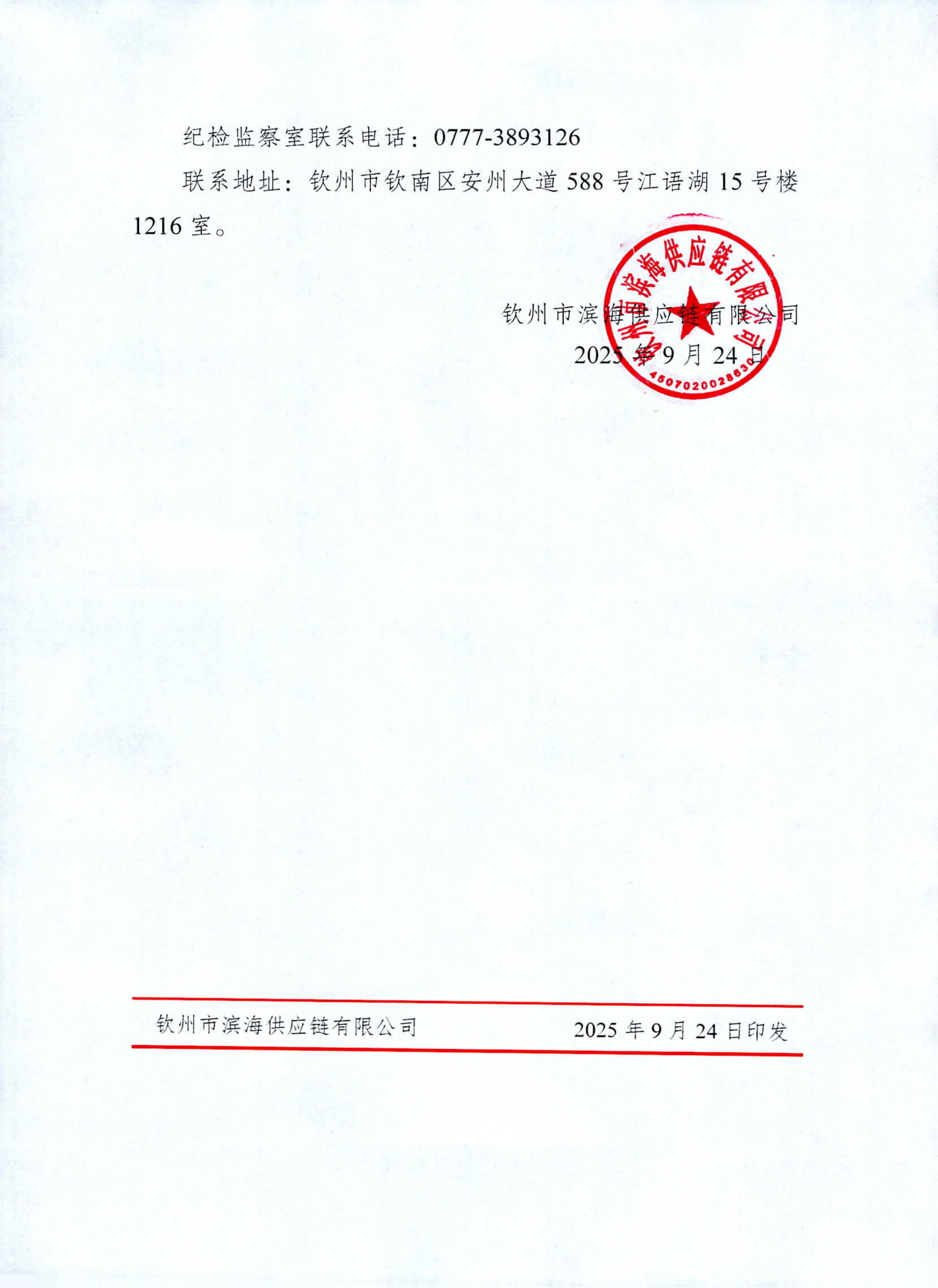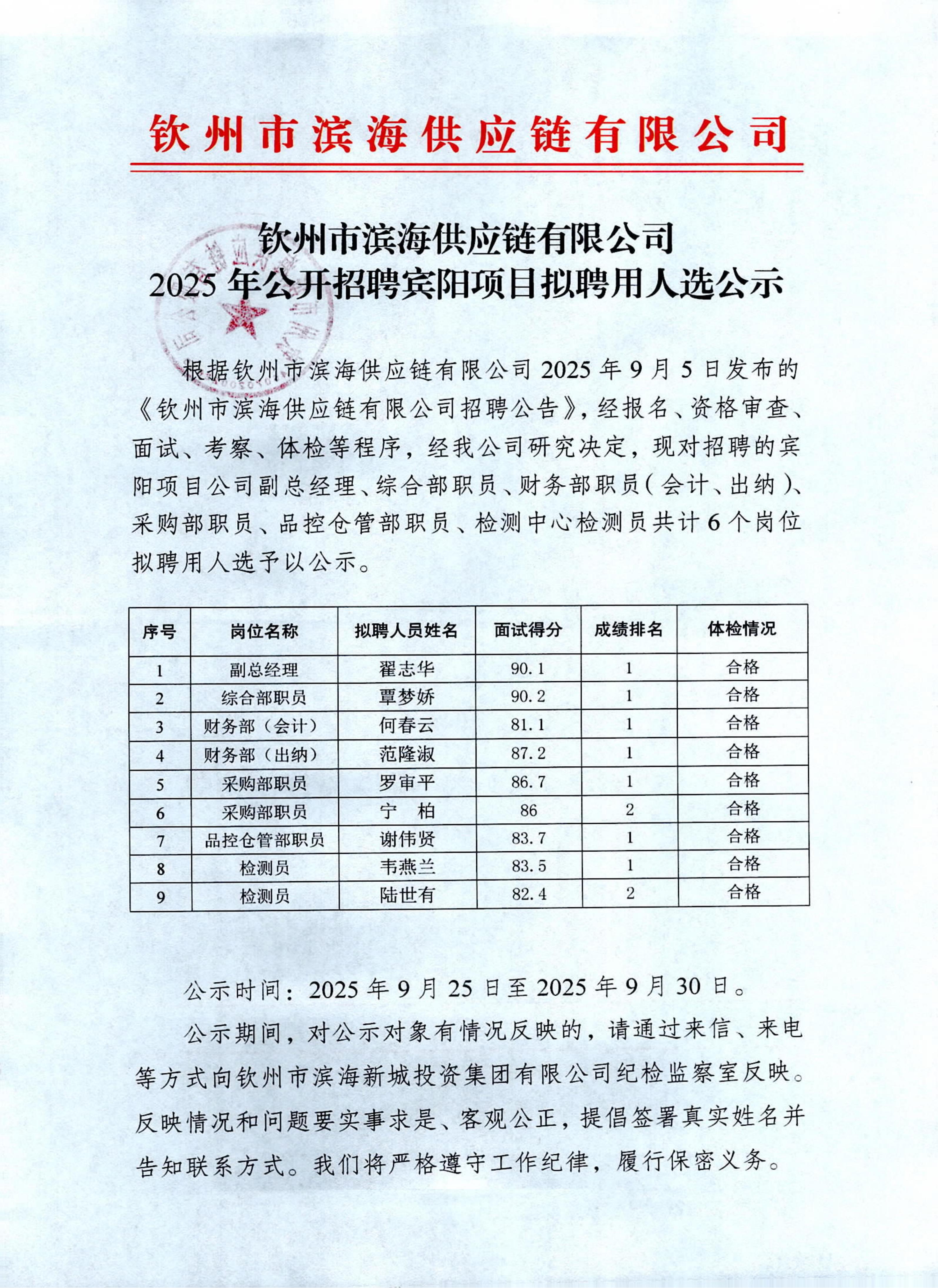 欽州市濱海供應(yīng)鏈有限公司2025年公開(kāi)招聘賓陽(yáng)項(xiàng)目擬聘用人選公示