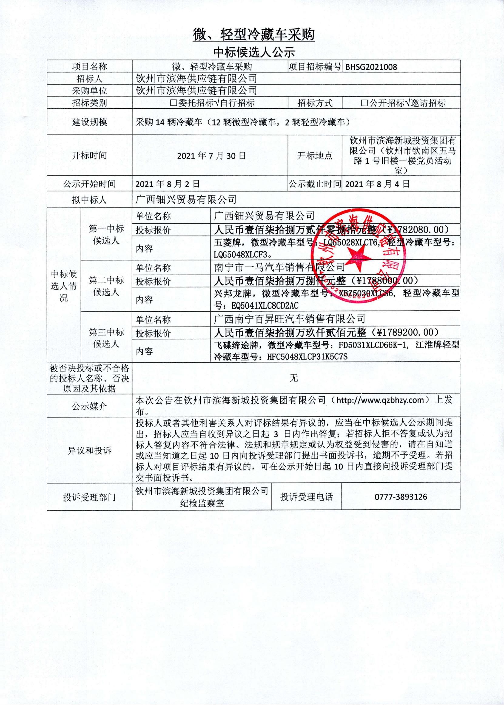微、輕型冷藏車采購(gòu)中標(biāo)候選人公示
