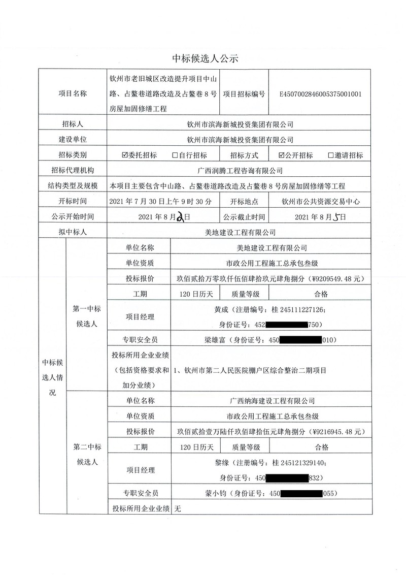 欽州市老舊城區(qū)改造提升項(xiàng)目中山路、占鰲巷道路改造及占鰲巷8號(hào)房屋加固修繕工程-中標(biāo)候選人公示