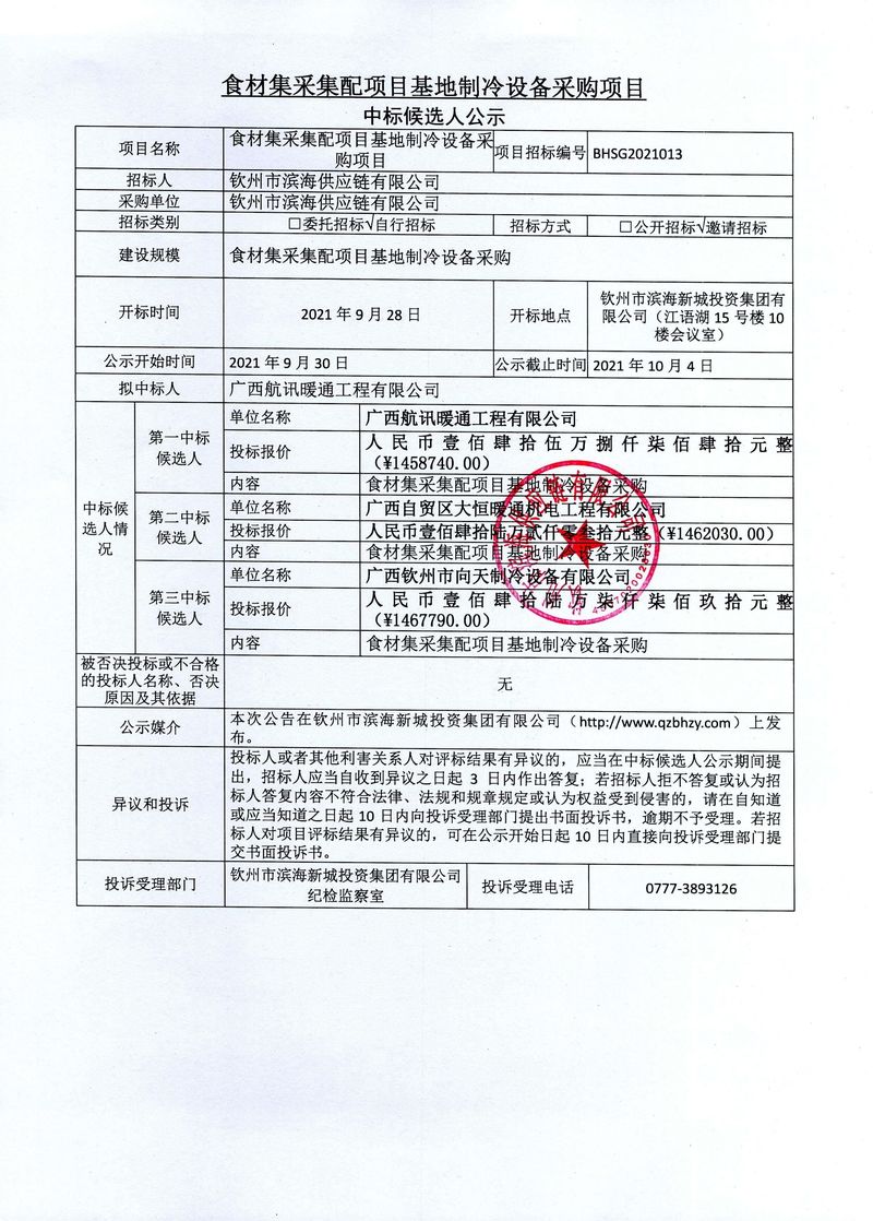 食材集采集配項(xiàng)目基地制冷設(shè)備采購(gòu)項(xiàng)目中標(biāo)候選人公示