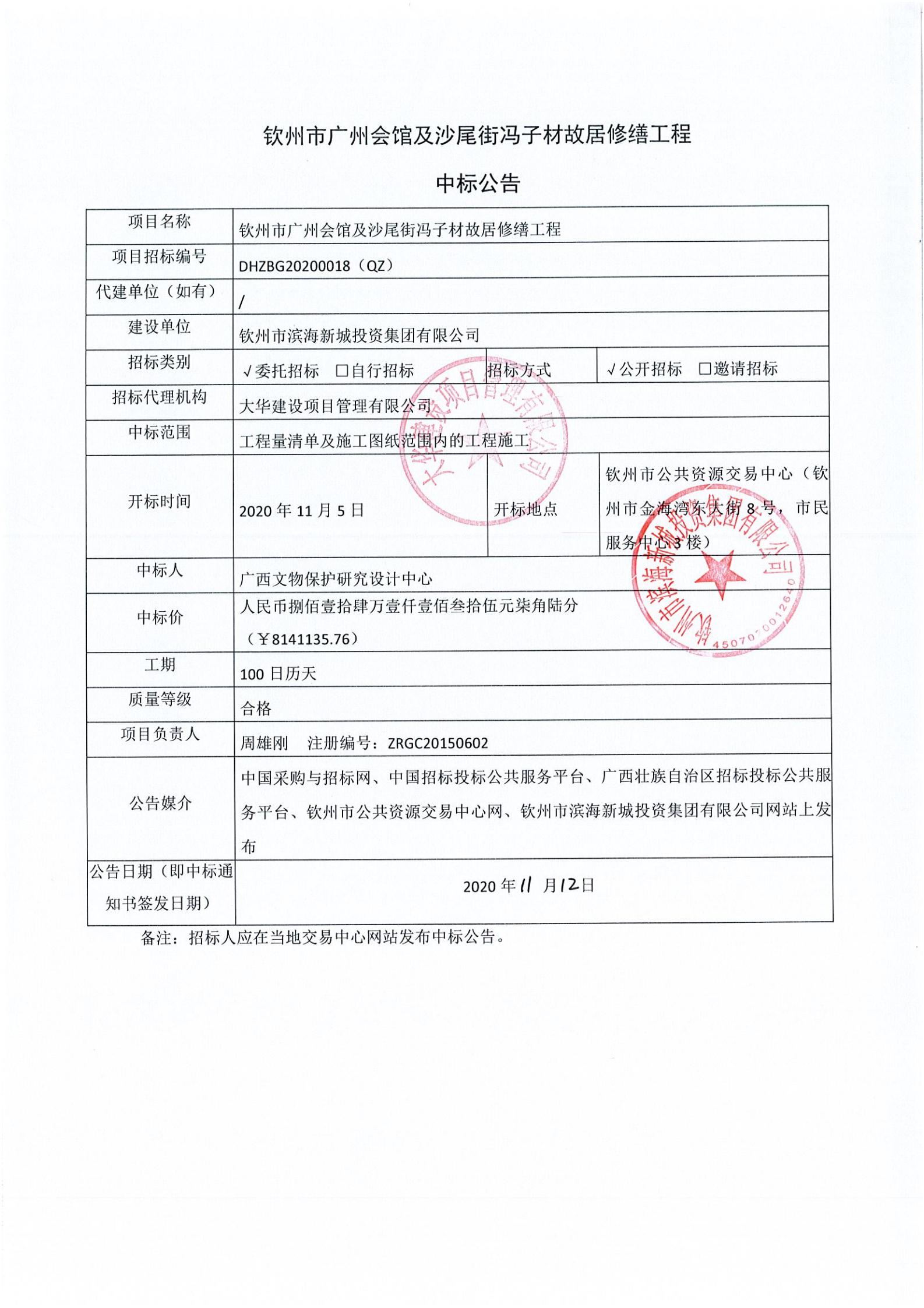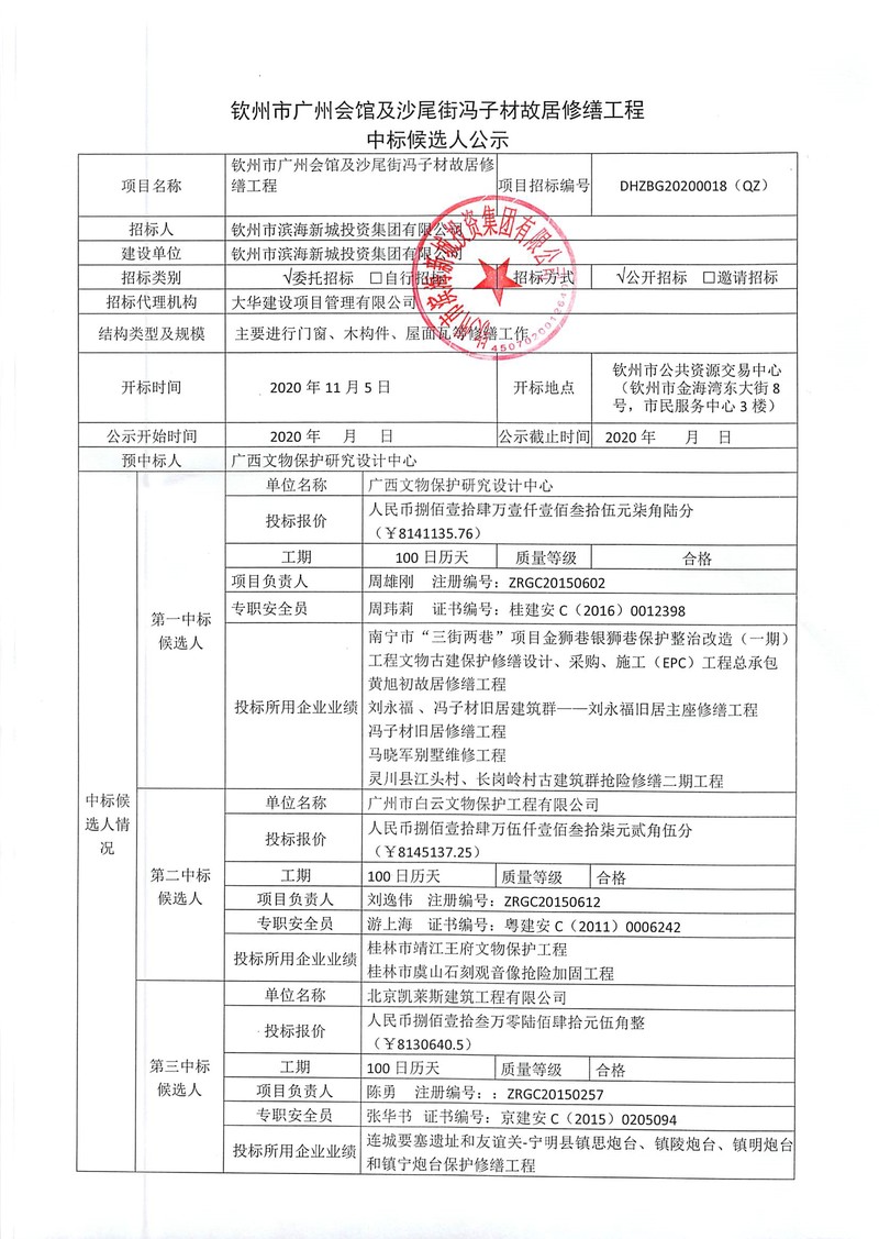 欽州市廣州會館及沙尾街馮子材故居修繕工程-中標(biāo)候選人公示