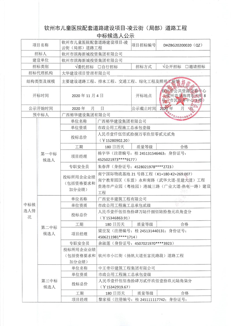 欽州市兒童醫(yī)院配套道路建設(shè)項目—凌云街(局部)道路工程中標(biāo)候選人公示