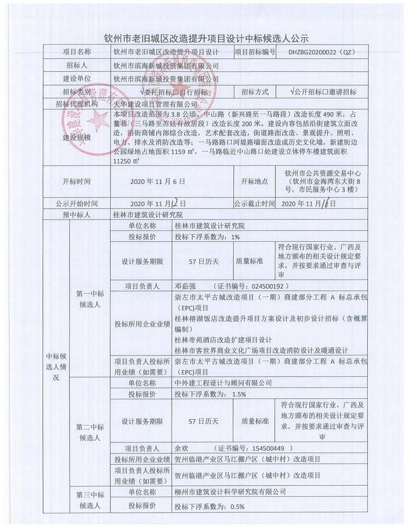 欽州市老舊城區(qū)改造提升項目設(shè)計中標(biāo)候選人公示