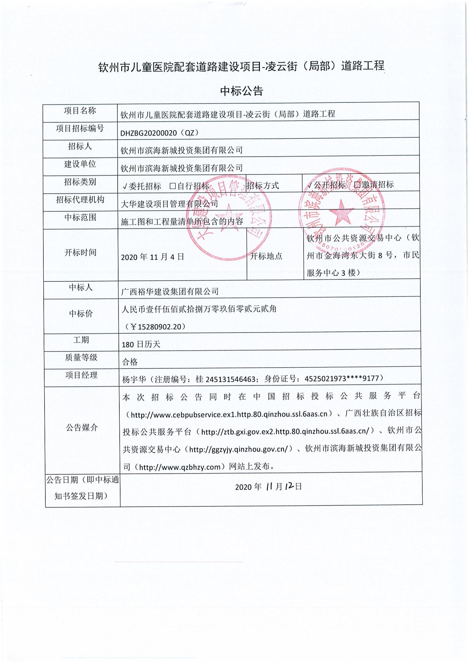 欽州市兒童醫(yī)院配套道路建設(shè)項目-凌云街(局部)道路工程中標(biāo)公告