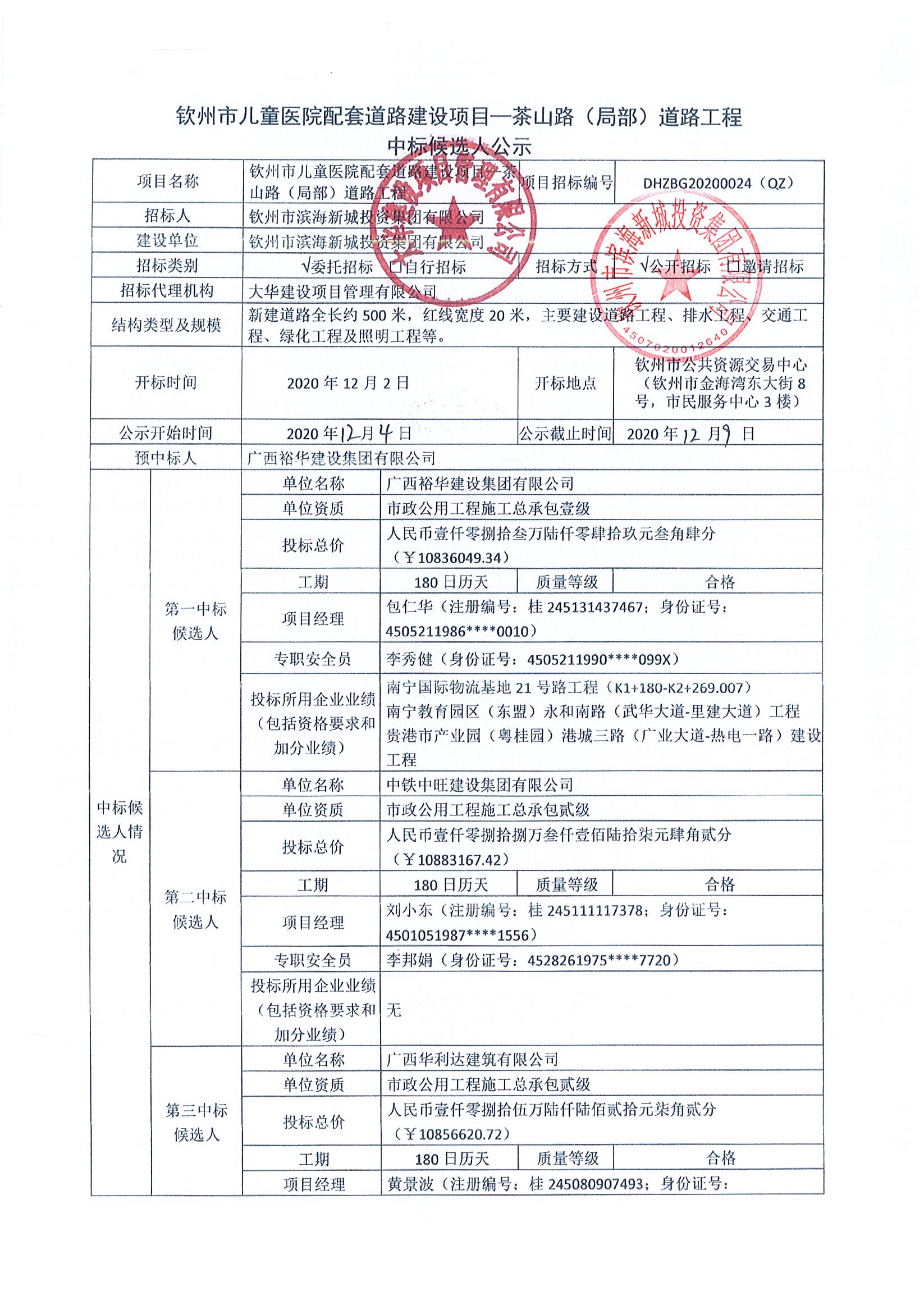 欽州市兒童醫(yī)院配套道路建設(shè)項目—茶山路(局部)道路工程中標(biāo)候選人公示