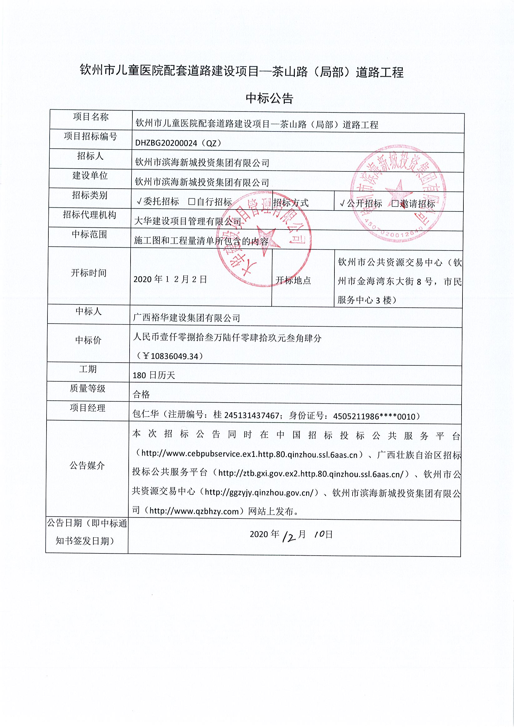 欽州市兒童醫(yī)院配套道路建設(shè)項目-茶山街(局部)道路工程中標(biāo)公告