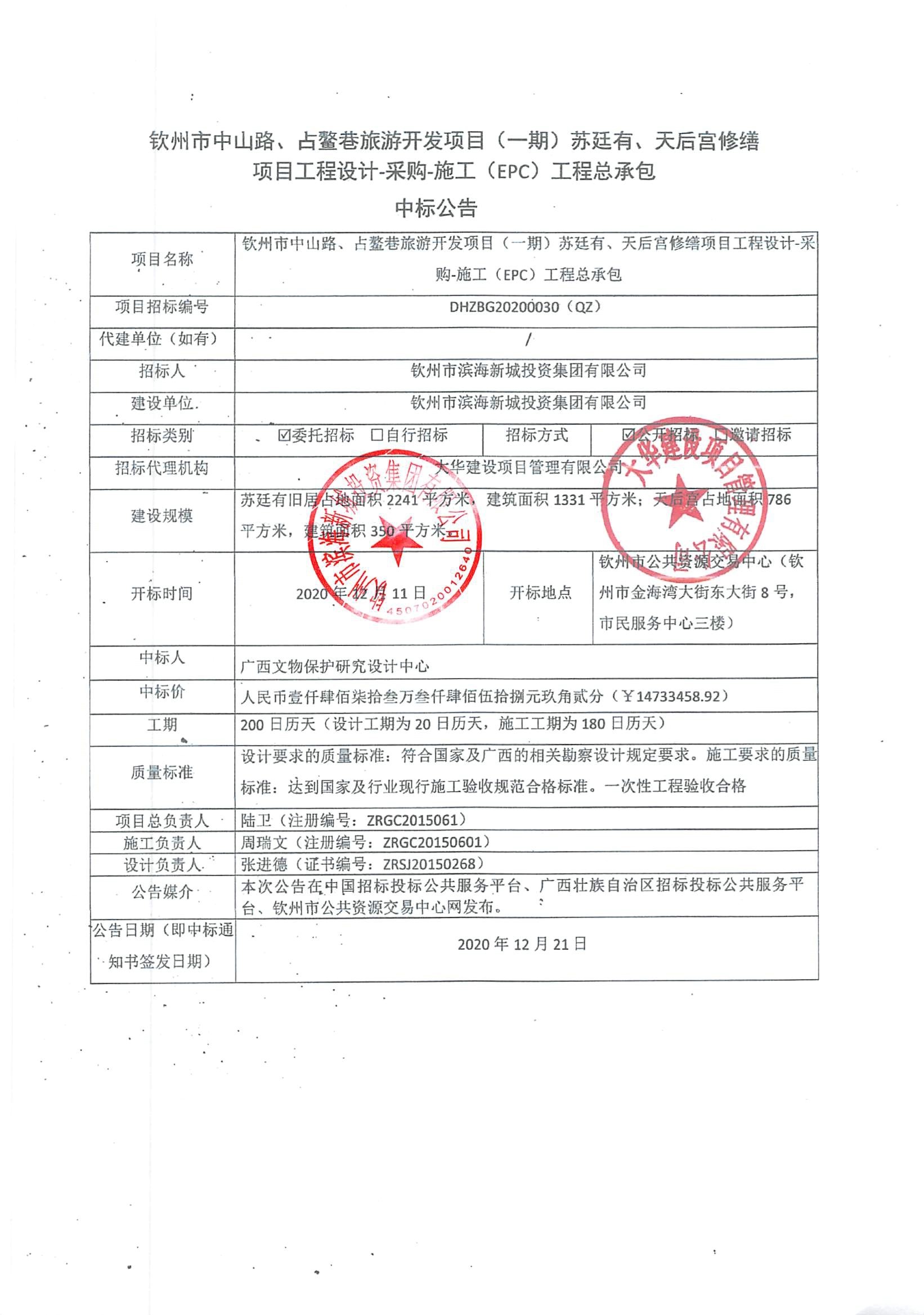 中標(biāo)公示-欽州市中山路、占鰲巷旅游開發(fā)項目(一期)蘇廷有、天后宮修繕項目工程設(shè)計-采購-施工(EPC)工程總承包中標(biāo)公告