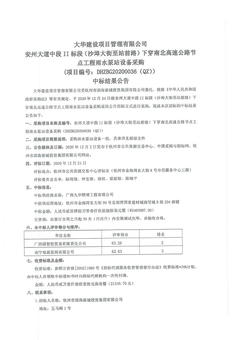 安州大道中段II標(biāo)段(沙埠大街至站前路)下穿南北高速公路節(jié)點工程雨水泵站設(shè)備采購中標(biāo)結(jié)果公告