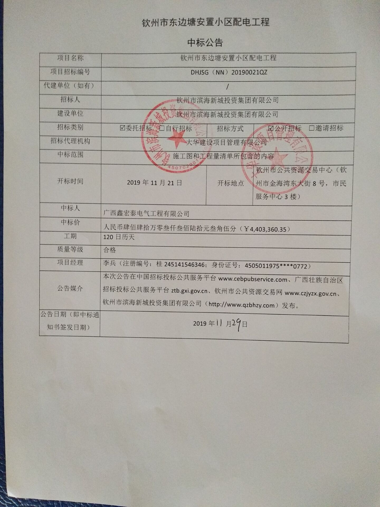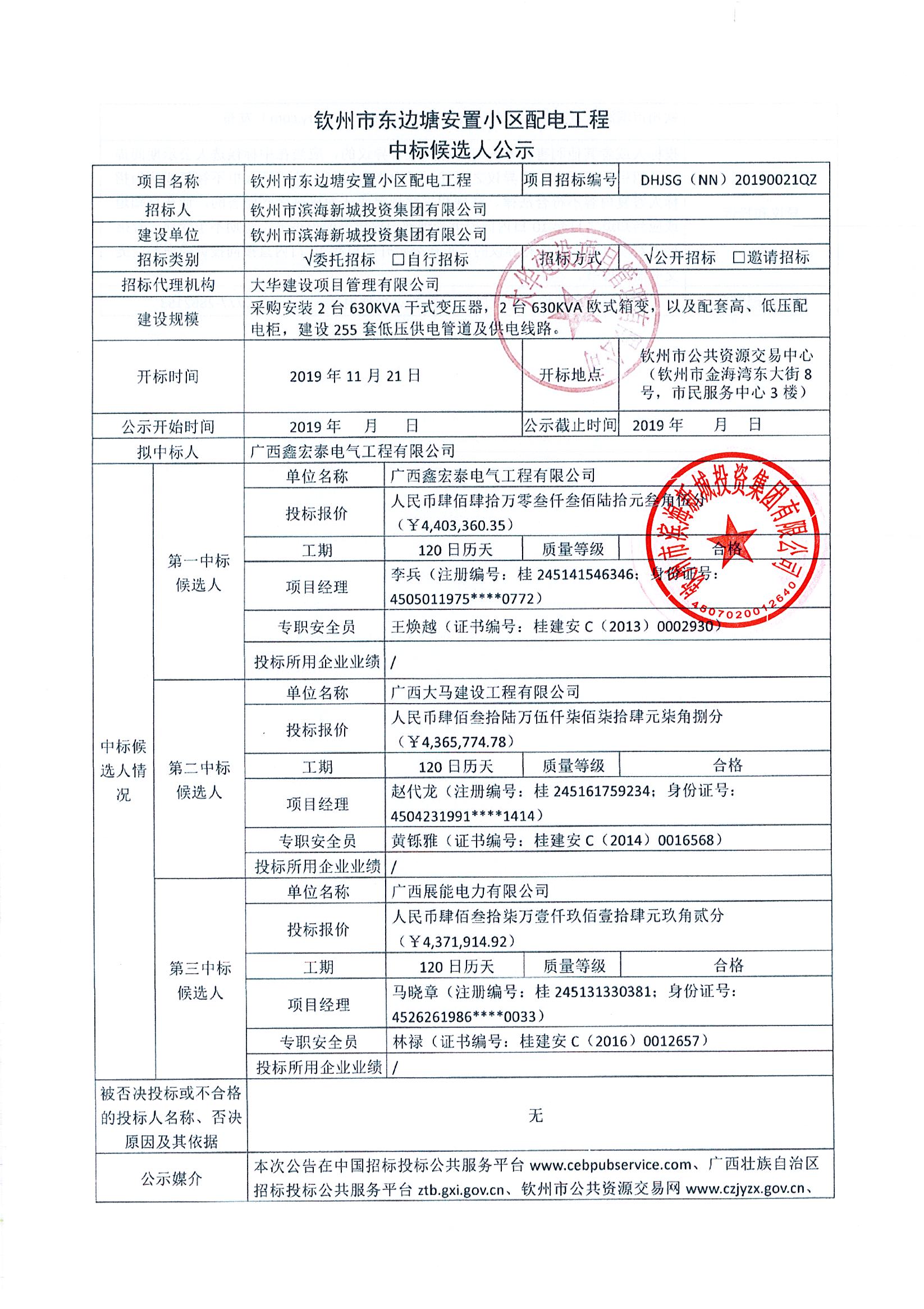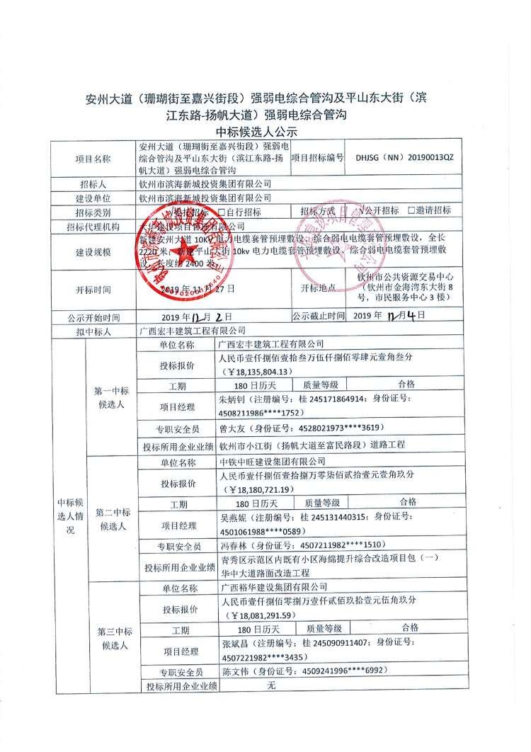 欽州市濱海新城嘉興街(嘉禾街-揚帆大道)道路工程及嘉興街(揚帆大道-安州大道)地下綜合管廊項目、欽州市公安局沙埠派出所項目、欽州市濱海新城安州大道中段與環(huán)城南路交叉路口工程綜合檢測中標候選人公示 項目名稱 欽州市濱海新城嘉興街(嘉禾街-揚帆大道)道路工程及嘉興街(揚帆大道-安州大道)地下綜合管廊項目、欽州市公安局沙埠派出所項目、欽州市濱海新...