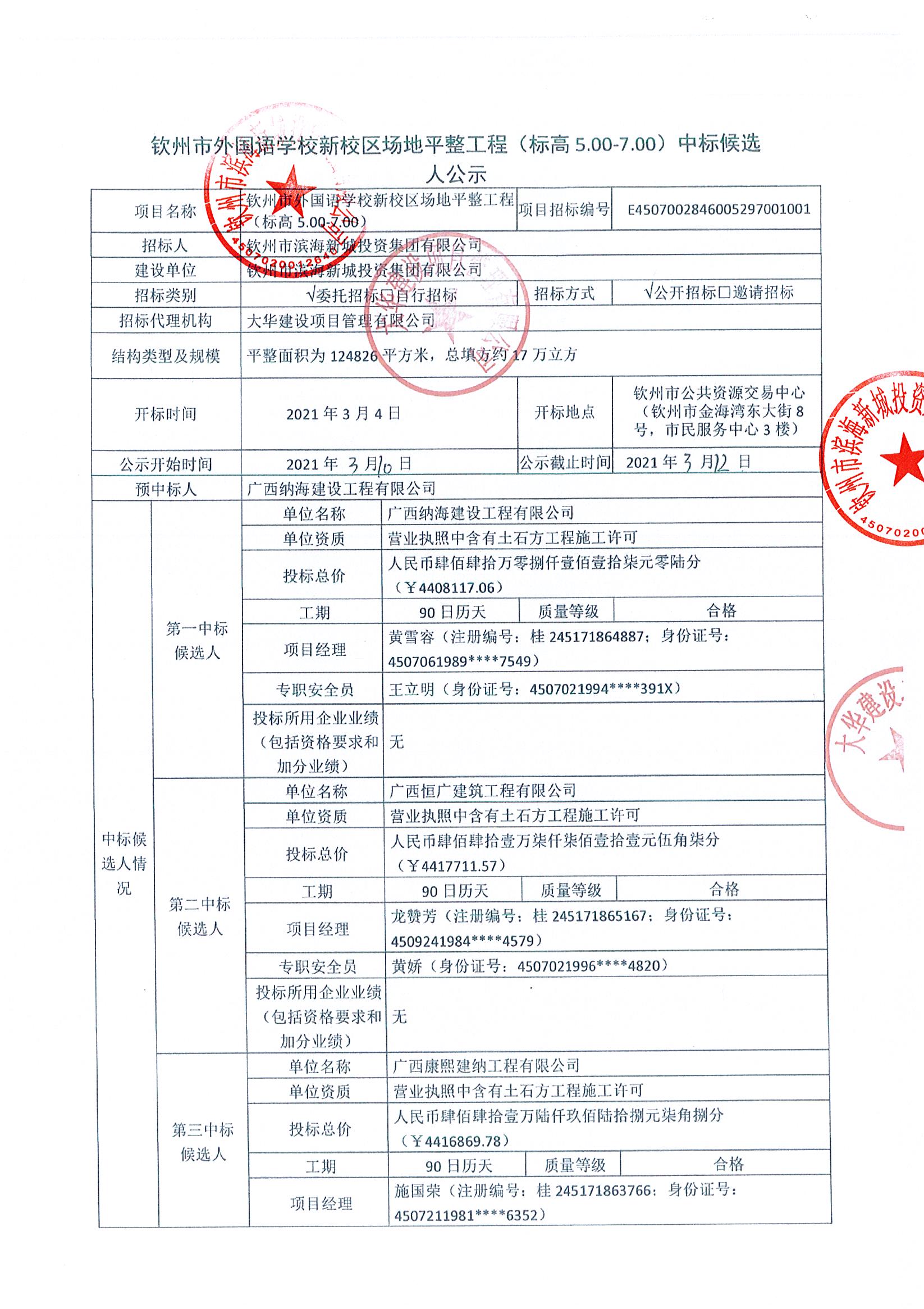 欽州市外國(guó)語(yǔ)學(xué)校新校區(qū)場(chǎng)地平整工程(標(biāo)高5.00-7.00)中標(biāo)候選人公示