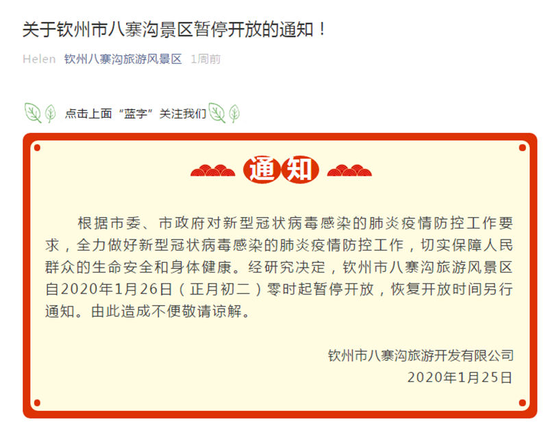 為進一步加強八寨溝景區(qū)新型冠狀病毒感染的肺炎疫情防控工作,有效防止疫情經(jīng)旅游途徑傳播,切實保障游客及公司員工身體健康和生命安全。根據(jù)欽州市委專題擴大會議對新型冠狀病毒感染肺炎疫情防控工作的部署,欽州市文化廣電體育和旅游局《關于取消欽州市 2020 年春節(jié)期間文化體育旅游活動和暫停相關文化體育旅游業(yè)務的通知》,以及欽州市文化廣電體育和旅游局《關于全市A級景區(qū)、鄉(xiāng)村旅游區(qū)、農(nóng)家樂暫停對外開放的通知》,...