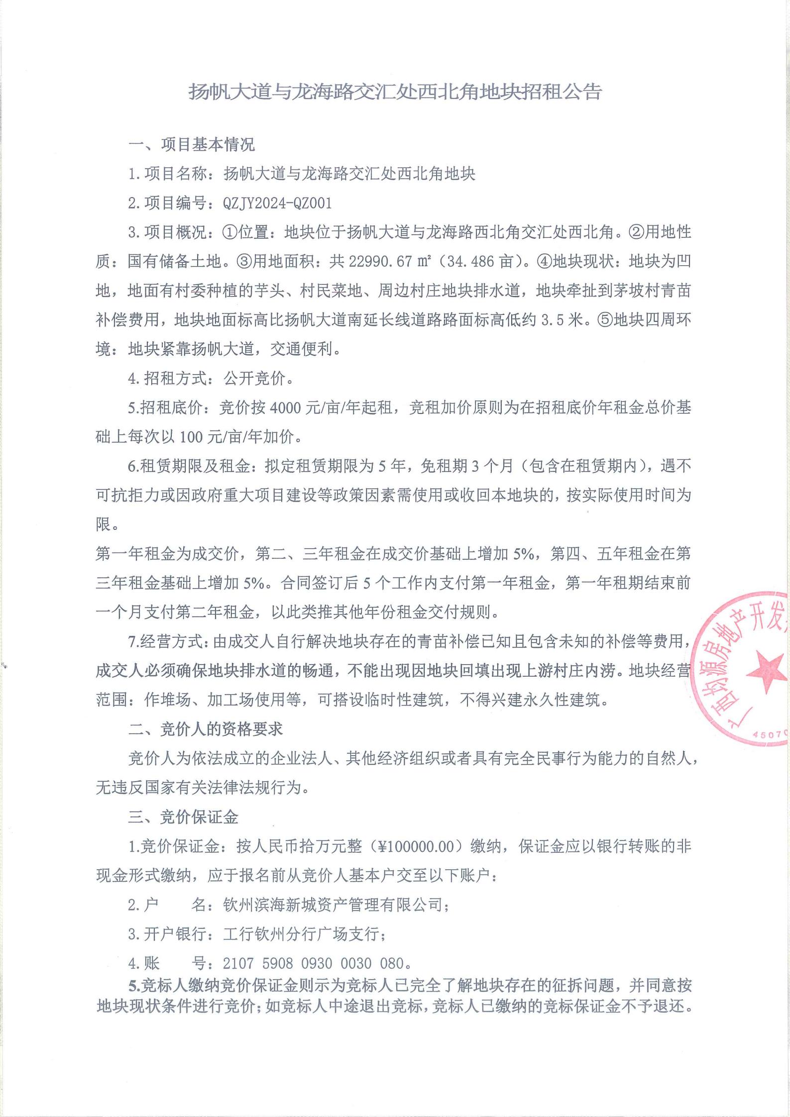 揚(yáng)帆大道與龍海路交匯處西北角地塊招租公告