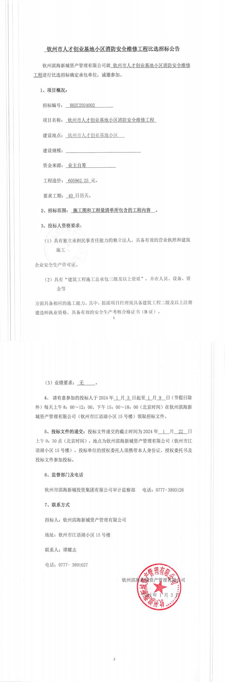 欽州市人才創(chuàng)業(yè)基地小區(qū)消防安全維修工程比選招標公告