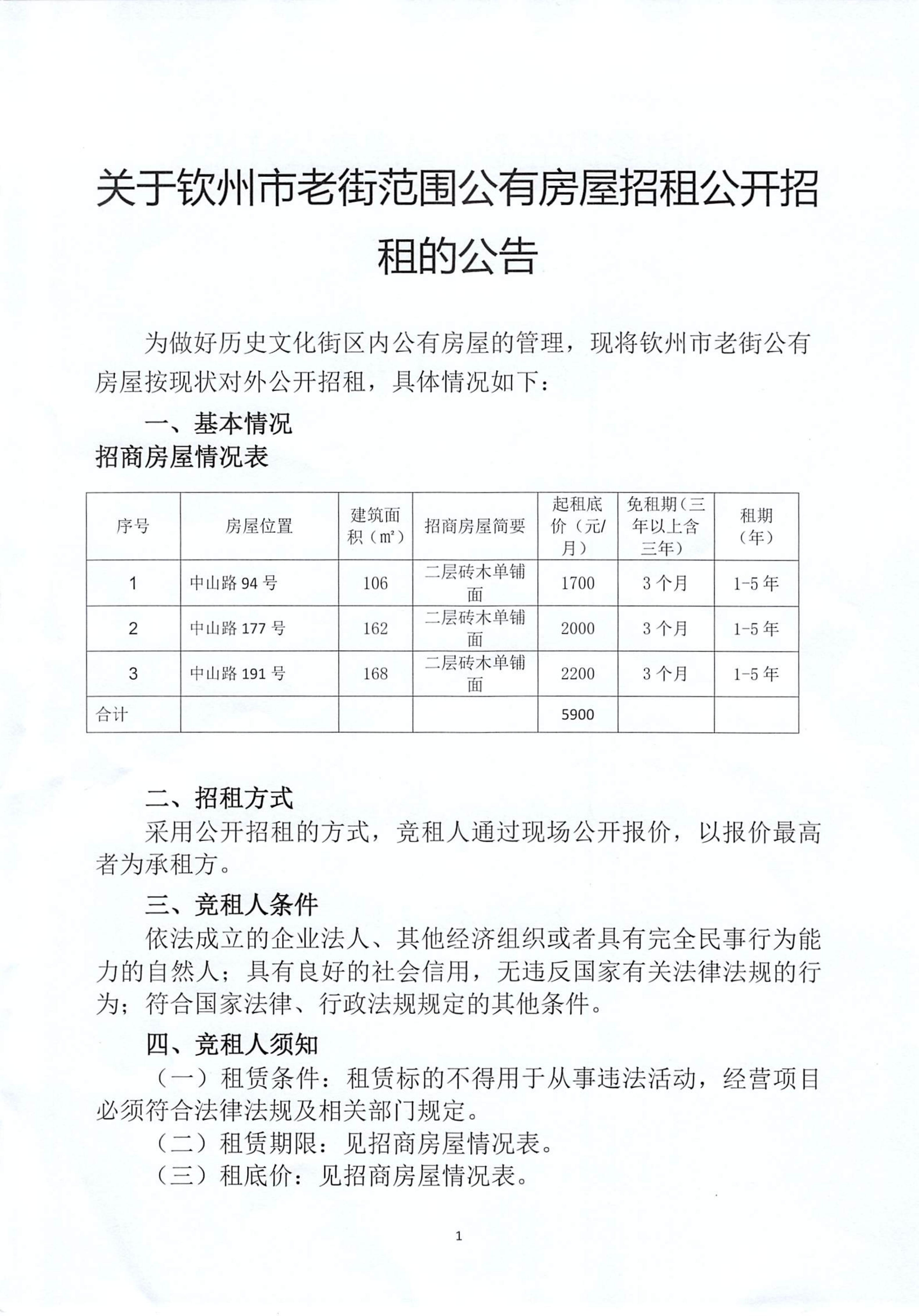 關(guān)于欽州市老街范圍公有房屋招租公開招租的公告